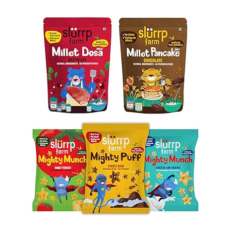 slurrp farm ragi tiffin combo pack of 5 360g 150g beetroot dosa mix no maida chocolate pancake mix and pack of 3x20g of non fried puffs ragi non fried ready to eat snack