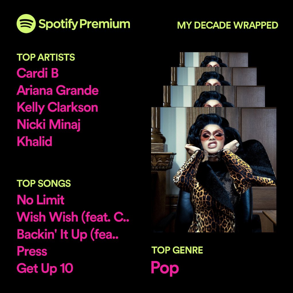 𓂀 on twitter my decade wrapped my life would have been so different without each of this artist s music thank you all iamcardib arianagrande kellyclarkson nickiminaj thegreatkhalid spotifywrapped spotifywrapped2019 spotify spotify https